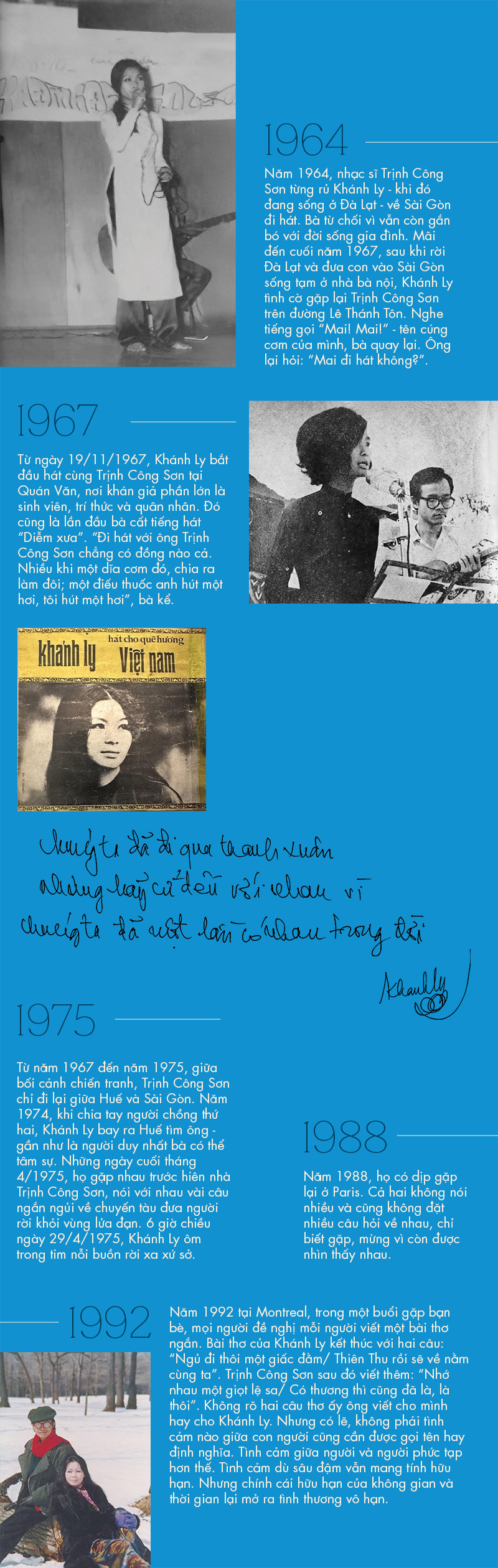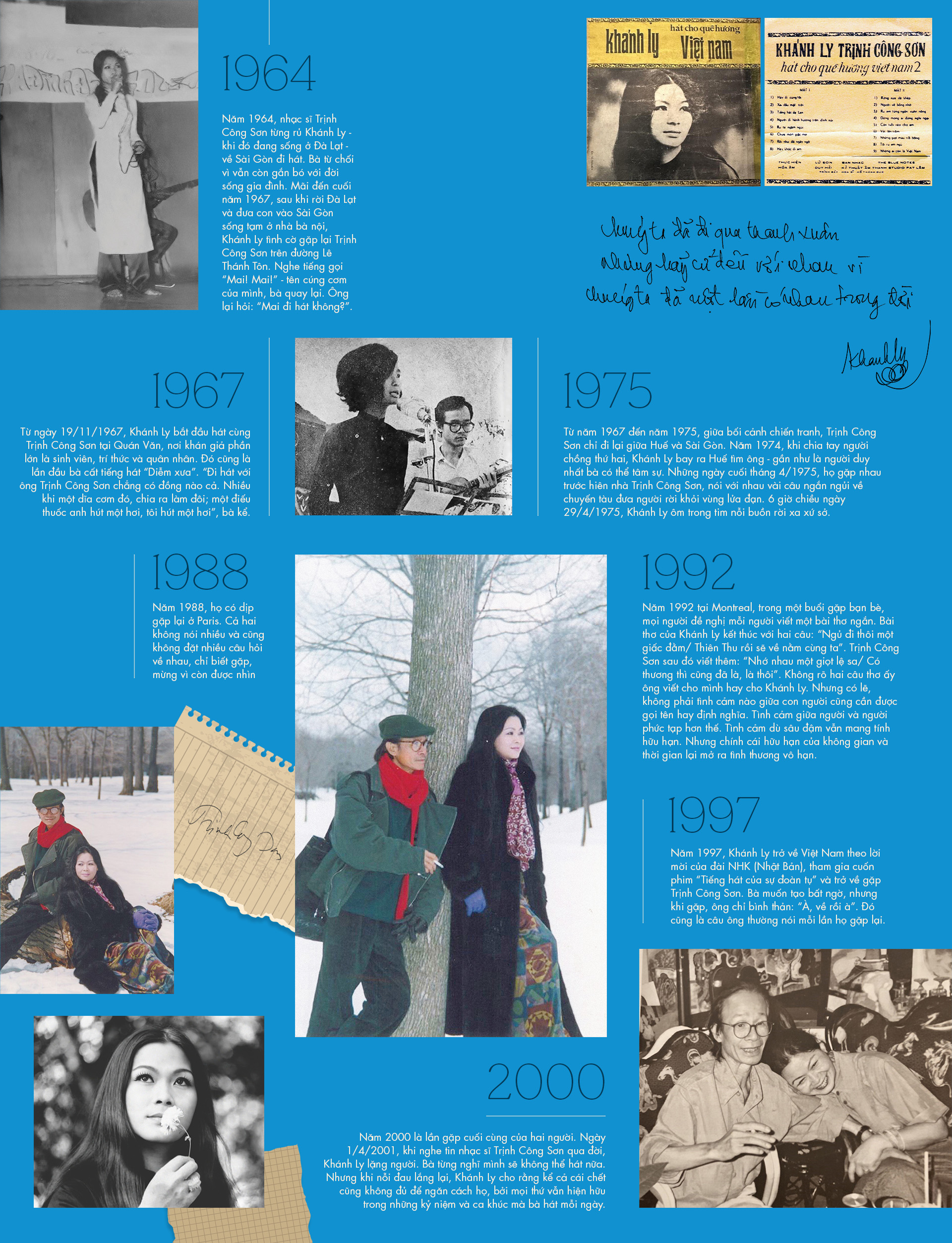 Mới đó đã qua 60 năm. Trong cuốn sách mới ra mắt, có đoạn Khánh Ly chia sẻ với nhà báo Phan Đăng: “Không phải chỉ có nhạc ông Trịnh Công Sơn mới đẹp, nhạc Văn Cao, nhạc Đoàn Chuẩn, nhạc Phạm Duy… cũng đẹp. Nhưng tại sao lại giữ trong mình âm nhạc của Trịnh Công Sơn lâu thế, là vì chưa tìm thấy được cái đẹp nào khác để thay thế. Càng ngày càng thấy ồ, may quá, cuộc đời mình có những cái đẹp này để sống với nó. Để chìm vào nó”. Dường như, cái đẹp trong đời sống khi tìm được sự đồng điệu thì có thể sống đời. Như nhạc sĩ Trần Tiến nhận định: “Anh Sơn và chị Khánh Ly, nói đến sự kết hợp giữa âm nhạc với nhau, là một cặp đôi chắc là cả trăm năm nữa không có. Tức là một người hiểu nhạc một người, một người hiểu giọng hát một người”.