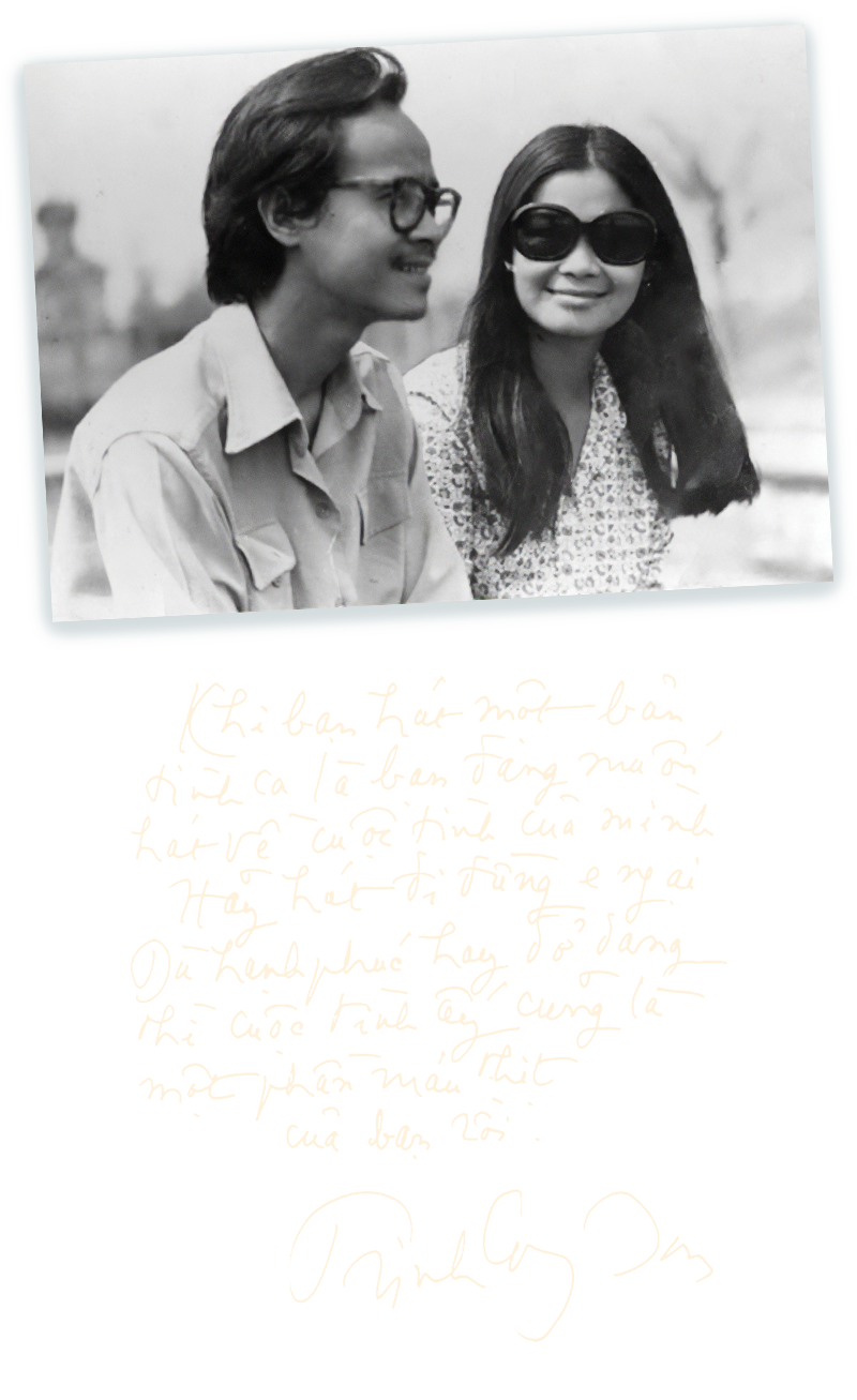 Trong quyển sách, ca sĩ Khánh Ly dành cho người bạn của mình những lời trìu mến: “Hình như bắt đầu từ ngay những giây phút đầu tiên, anh và em đã tập cho nhau cách nói và nghe bằng sự im lặng. Và chính vì như thế, anh em mình luôn gần nhau. Không có rừng sâu, núi thẳm, chẳng có biển rộng, sông dài. Lại càng không có bao nhiêu năm trời, mình vẫn nghe tiếng nhau trong bình minh, trong đêm tối, trong nắng cháy, trong mưa giông, bởi anh là hình, em là bóng”.