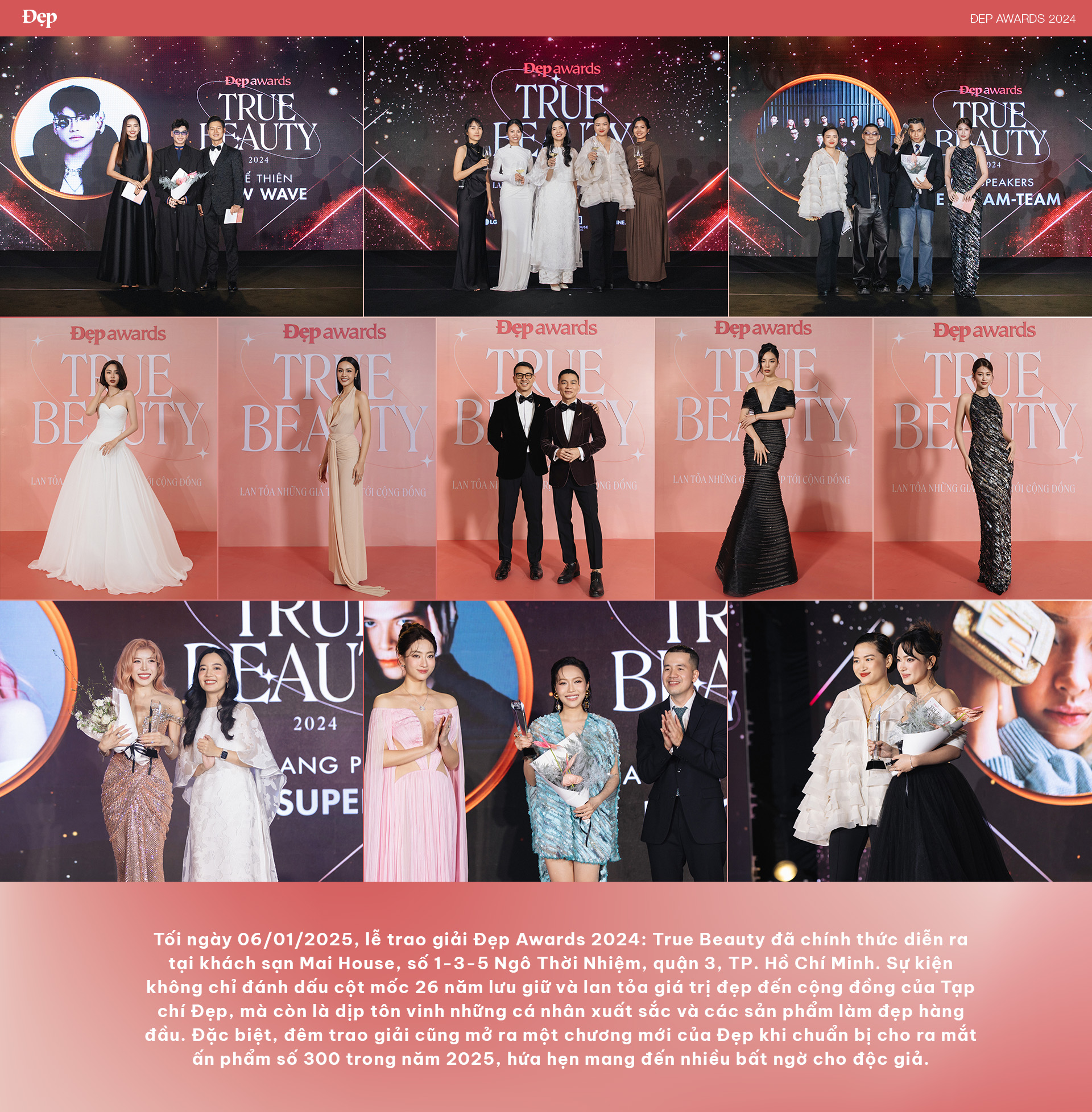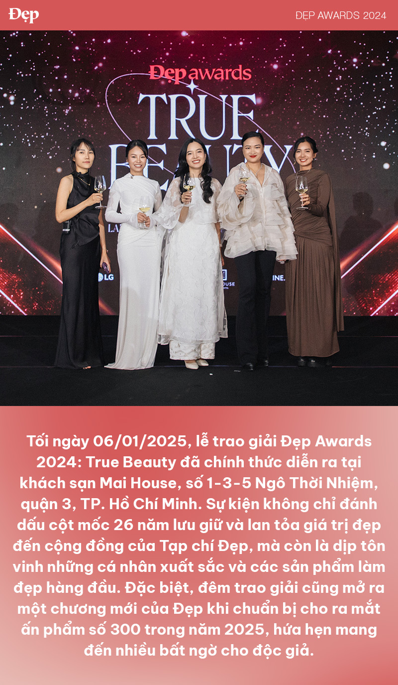 Câu nói này đã trở thành kim chỉ nam giúp Đẹp đối mặt với những thách thức từ vô số kênh thông tin đa dạng ngoài kia. Chúng tôi luôn tìm kiếm, lựa chọn và tôn vinh những giá trị đẹp đẽ, để gạn đục khơi trong, đãi cát tìm vàng, lan tỏa vẻ đẹp qua từng con chữ và khung hình, thay vì chạy theo thông tin sai lệch, giật gân hay câu khách. Sự sáng tạo một cách bình tĩnh, tử tể và tôn vinh những vẻ đẹp thực thụ chính là lý do Đẹp giữ được vị thế và uy tín trong suốt ¼ thế kỷ qua. Tối nay, tại Đẹp Awards 2024 với chủ đề “True Beauty,” chúng tôi muốn lan tỏa tinh thần và nguồn cảm hứng ấy qua gần 40 giải thưởng được Ban biên tập lựa chọn kỹ càng. Bên cạnh việc vinh danh những sản phẩm làm đẹp chất lượng và những nhân vật rực rỡ trong ánh hào quang nghệ thuật, Đẹp còn tìm kiếm và tôn vinh vẻ đẹp ẩn giấu trong những câu chuyện đời thường, đặc biệt dành sự trân trọng cho những người trẻ tài năng, miệt mài cống hiến cho cộng đồng”.