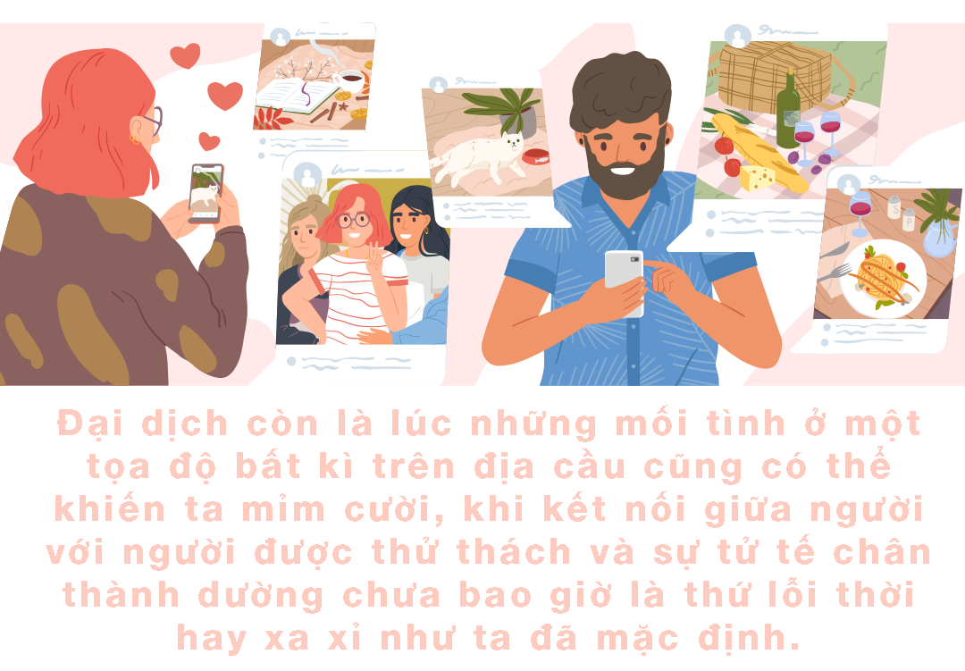 Rất khó để không nhắc đến đại dịch trong cuộc trò chuyện với bạn bè, nhưng chúng tôi giao hẹn sẽ chỉ nói về những điều tích cực. Một ngày bạn tôi tâm sự anh trân trọng sự thật rằng mình đang sống qua giai đoạn lịch sử của nhân loại. Bởi đại dịch không chỉ là những con số tăng cao hàng ngày, những thống kê kinh tế, những hỗn loạn thể hiện bản chất yếu ớt của hệ thống chính trị, xã hội, nhân sinh. Đại dịch còn là lúc những mối tình ở một tọa độ bất kì trên địa cầu cũng có thể khiến ta mỉm cười, khi kết nối giữa người với người được thử thách và sự tử tế chân thành dường chưa bao giờ là thứ lỗi thời hay xa xỉ như ta đã mặc định. Với tôi, nó là cảm giác hồi hộp khi nghe giọng mọi người qua điện thoại. Với ai đó, là khi họ học cách chia sẻ và chấp nhận thực sự với người bạn đời.
