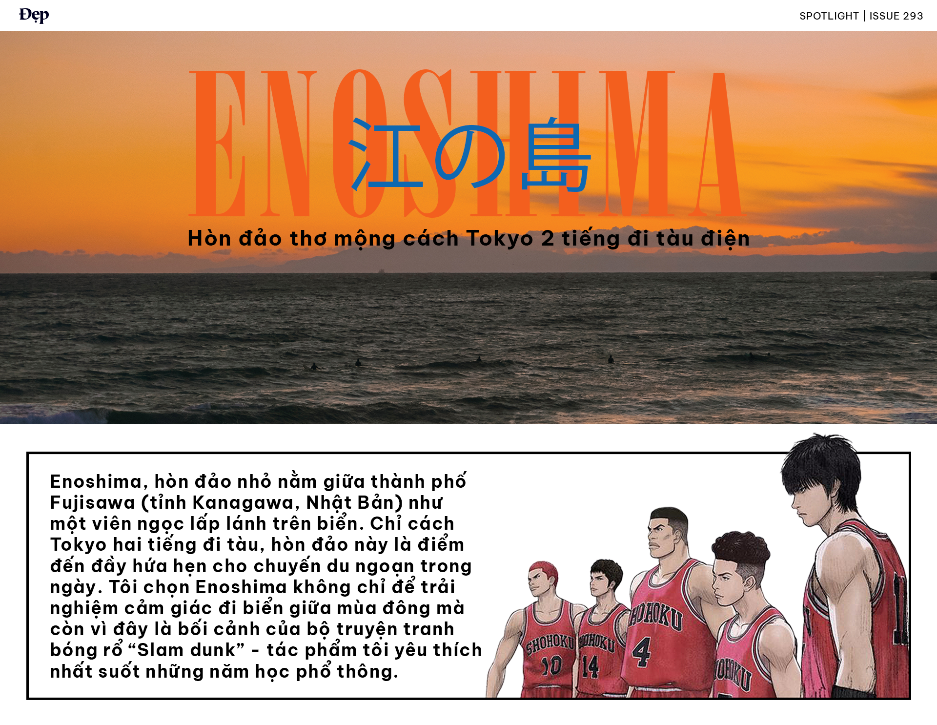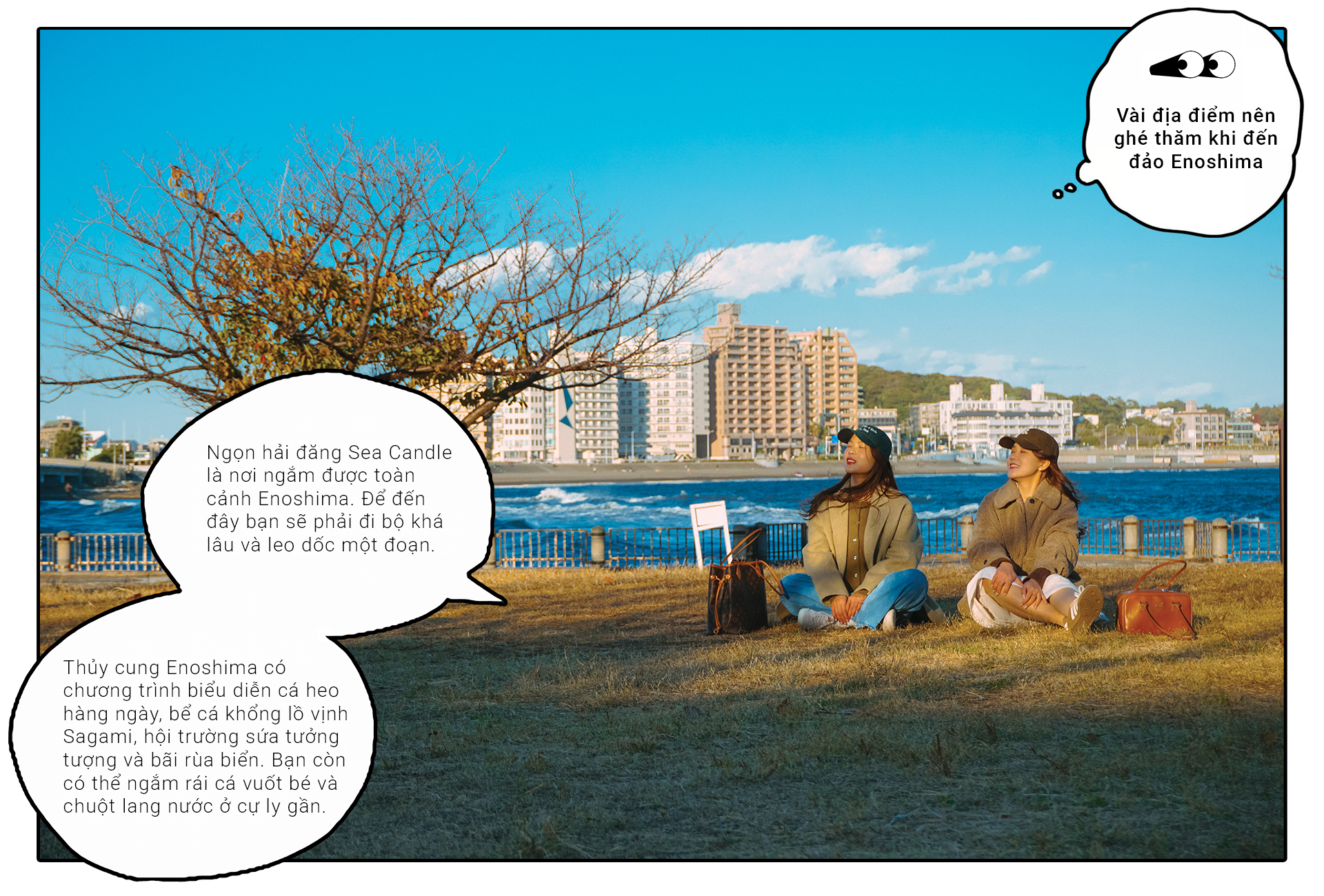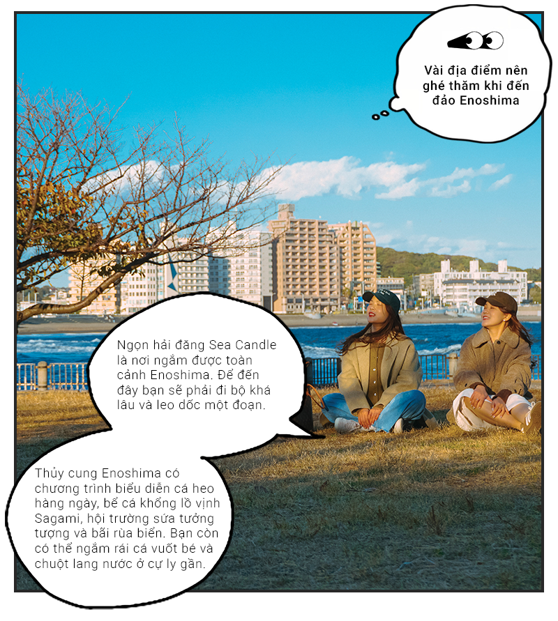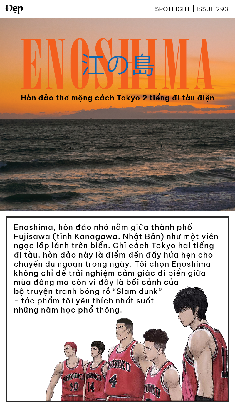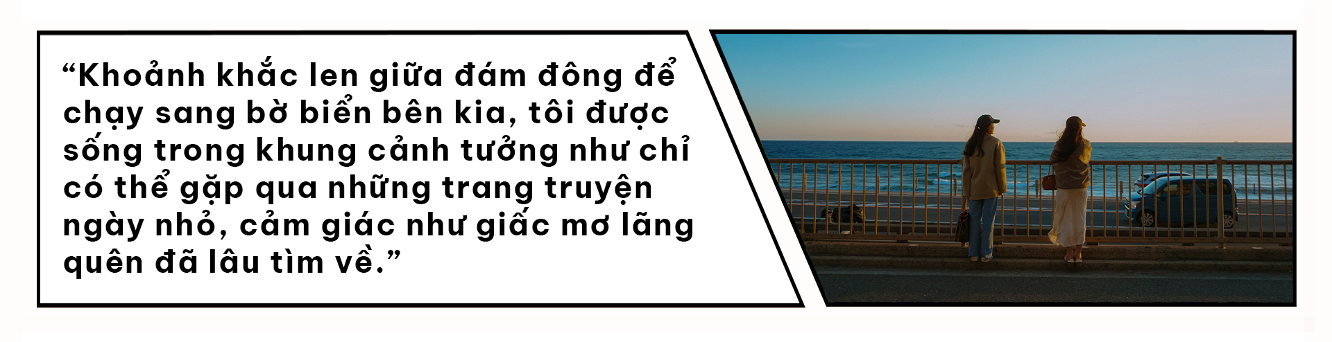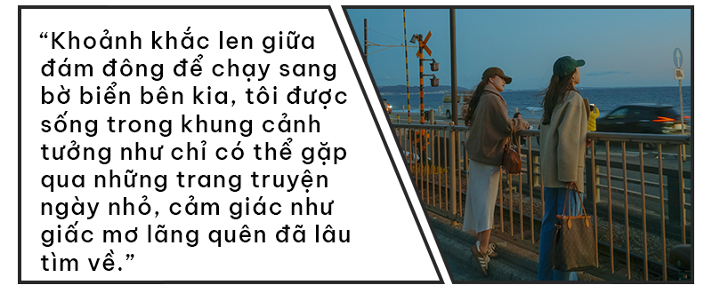 Khoảnh khắc len giữa đám đông để chạy sang bờ biển bên kia, tôi được sống trong khung cảnh tưởng như chỉ có thể gặp qua những trang truyện ngày nhỏ, cảm giác như giấc mơ lãng quên đã lâu tìm về. Khi mặt trời dần khuất, ráng chiều chạng vạng nhường chỗ cho sắc xanh thẫm, trăng non bắt đầu nhú lên trên đường chân trời. Hai tiếng quay về Tokyo, lòng tôi vẫn tràn đầy niềm hân hoan.