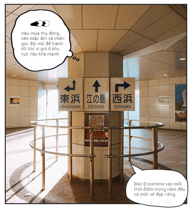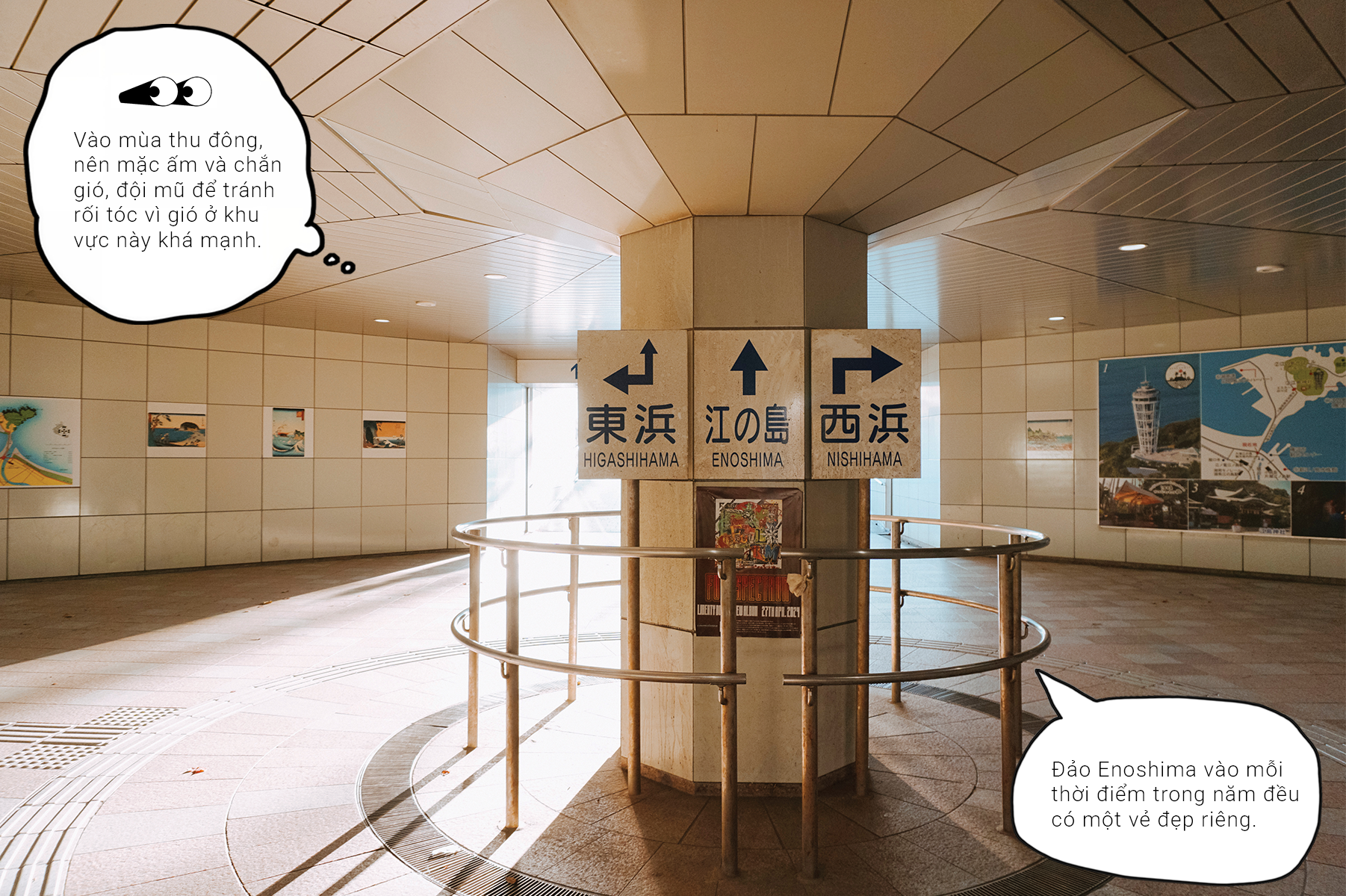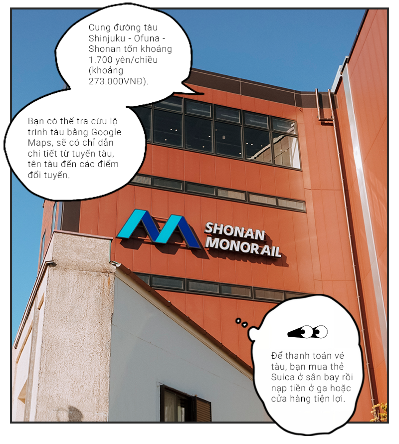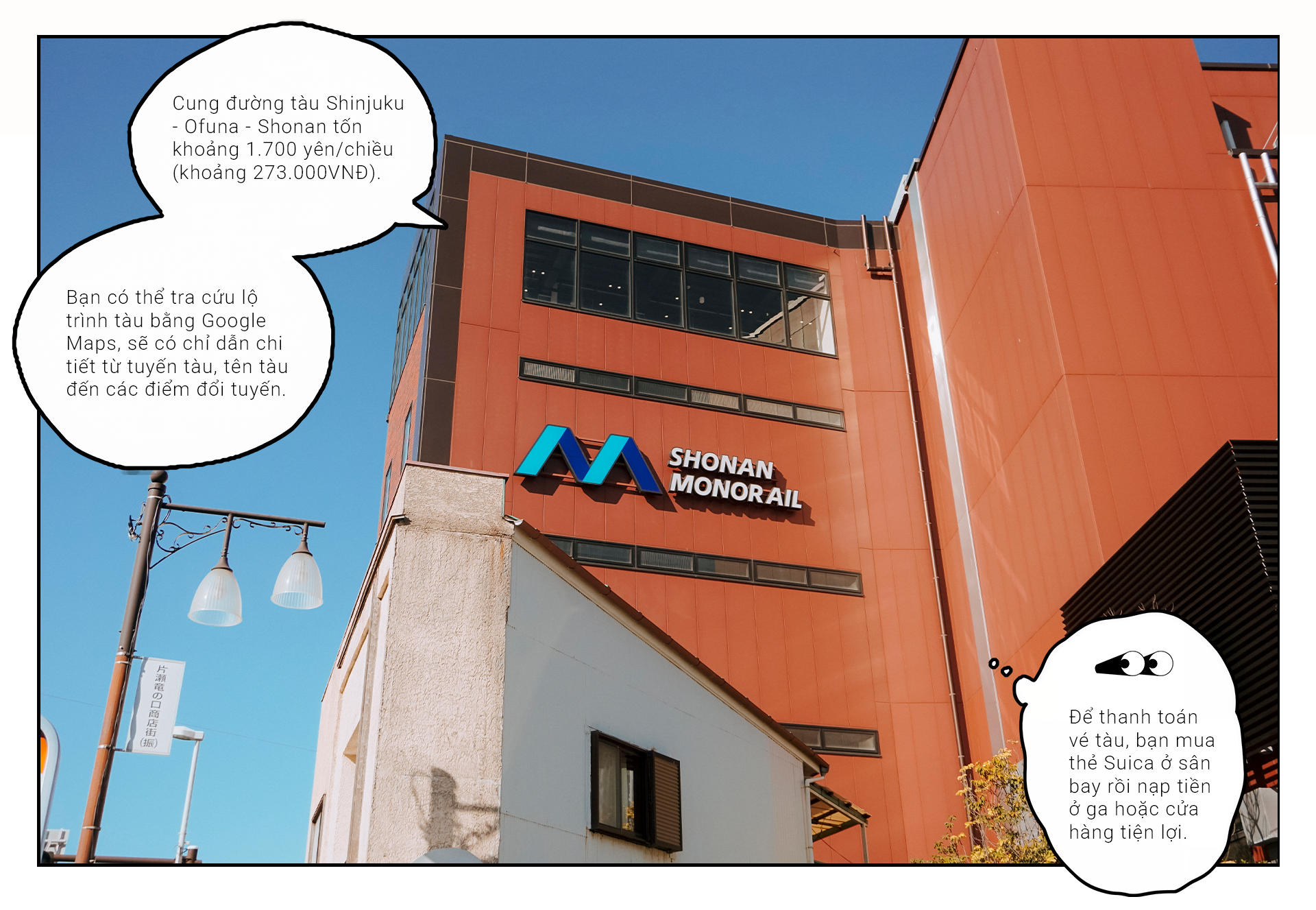 Để đến Enoshima có nhiều lộ trình khác nhau, nhưng hôm đó tôi chọn một cung đường có phần khác biệt, dù ngoằn ngoèo hơn. Khởi hành từ ga Shinjuku, tôi dừng tại ga Ōfuna để bắt tàu ray treo ngược Shonan. Đi xuyên qua những thành phố xinh đẹp như Kamakura và Fujisawa, chuyến tàu đặc biệt này phục vụ không chỉ du khách mà còn cả người dân địa phương trên hành trình đi học, đi làm hàng ngày. So với tàu chạy trên mặt đất, trải nghiệm trên tàu Shonan không có nhiều khác biệt. Tàu di chuyển êm ái, nhanh chóng, đặc biệt khi đi qua các đoạn đường hầm. Tuy nhiên, nếu bạn sợ độ cao, tốt nhất nên hạn chế nhìn ra ngoài cửa sổ.